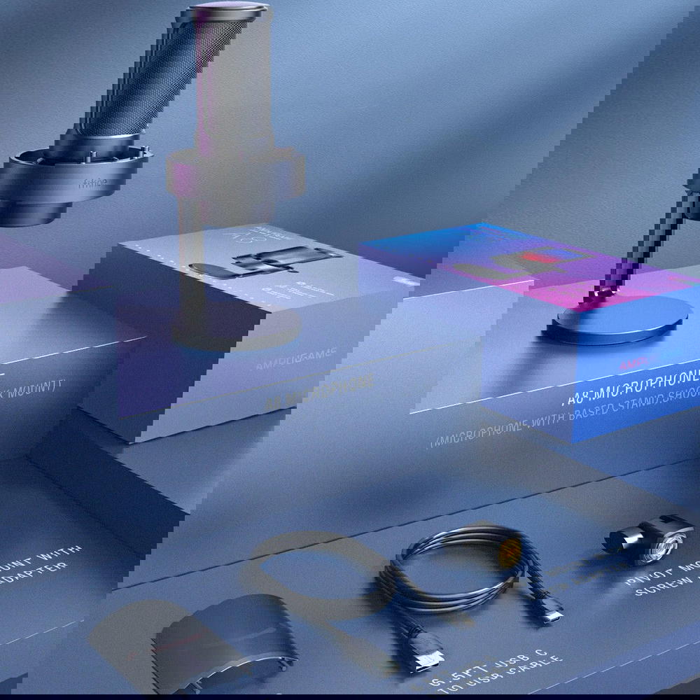 • يأتي مع حامل مكتب ومرشح بوب (Pop Filter) لتقليل الفرقعة الناتجة عن الهواء.